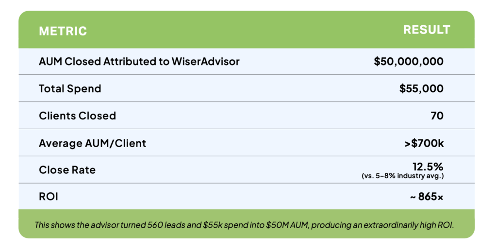 - $50M in AUM directly attributed to WiserAdvisor leads.